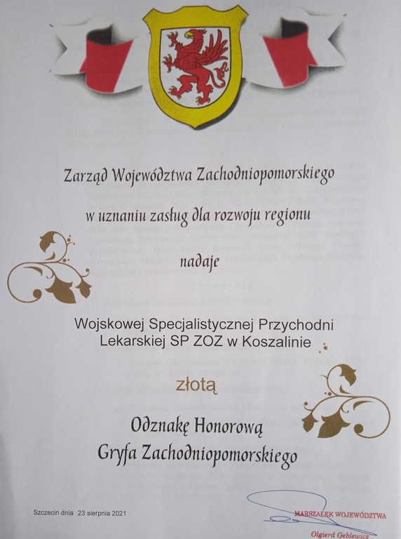 W dniu 6 listopada 2021 r. decyzją Zarządu Województwa Zachodniopomorskiego nasza Przychodnia została uhonorowana odznaczeniem Gryfa Zachodniopomorskiego.